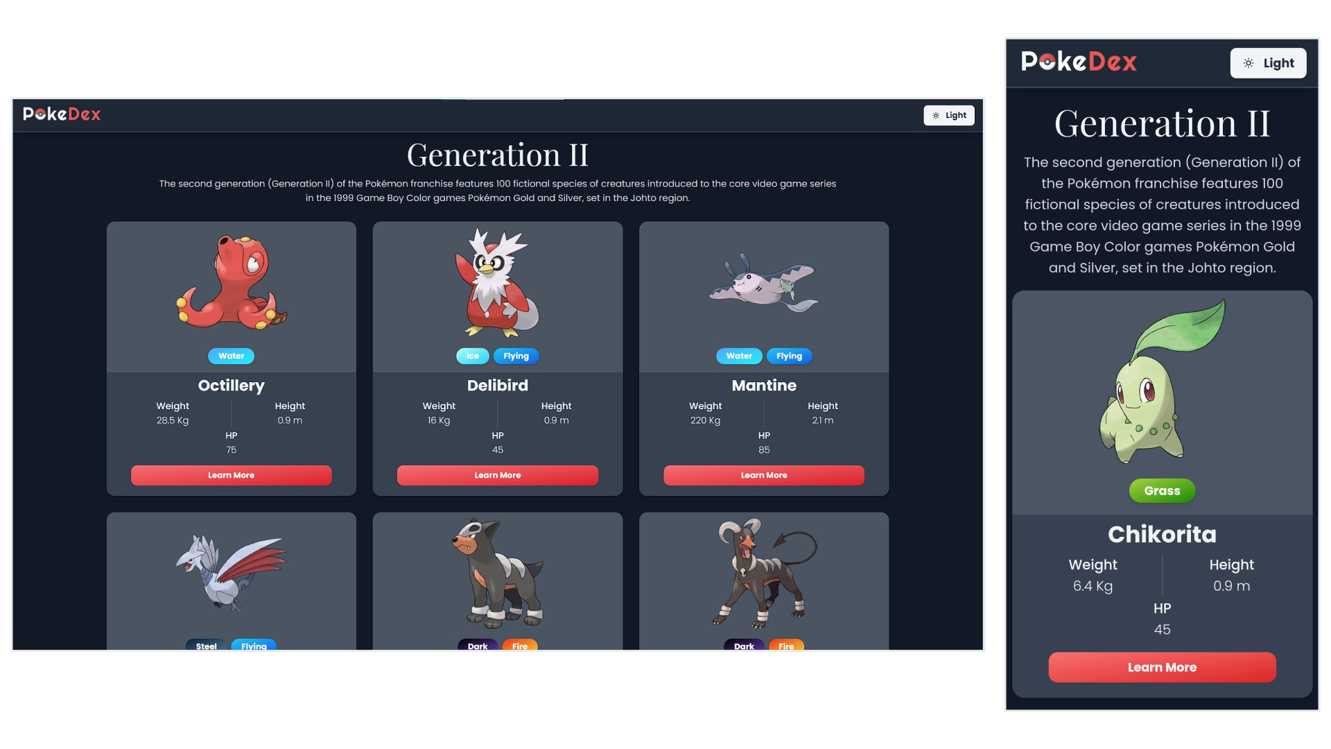 The HomePage displays a brief introduction for each pokemon generation and displays the starter pokemon for each generation along with their evolution. The website uses TailwindCSS for styling and each pokemon and its details are displayed in a card. Additionally, when the data is being loaded, skeleton cards are displayed as placeholders. This helps to improve the first-paint performance of the application.